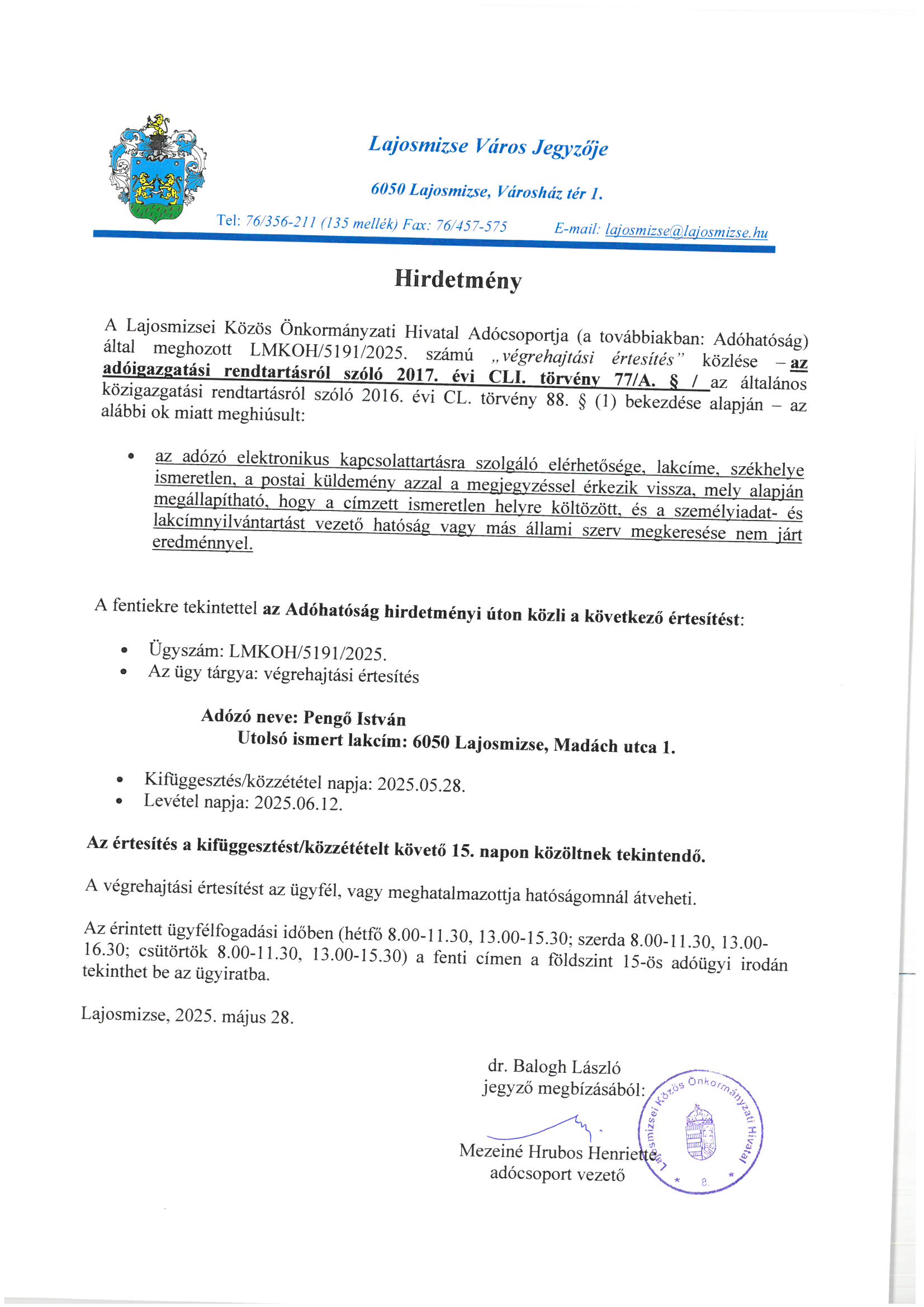 Kifüggesztés napja: 2025.05.19.