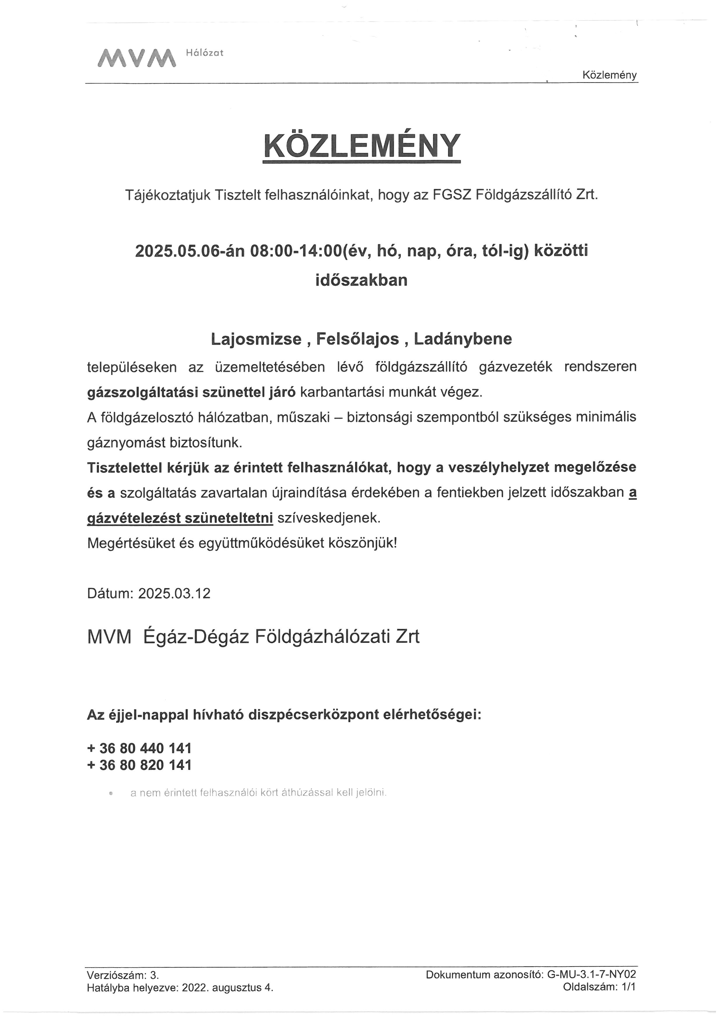 A Maxeron Kft. értesíti Lajosmizse lakosságát, hogy az alábbi területeken létesített kis-,