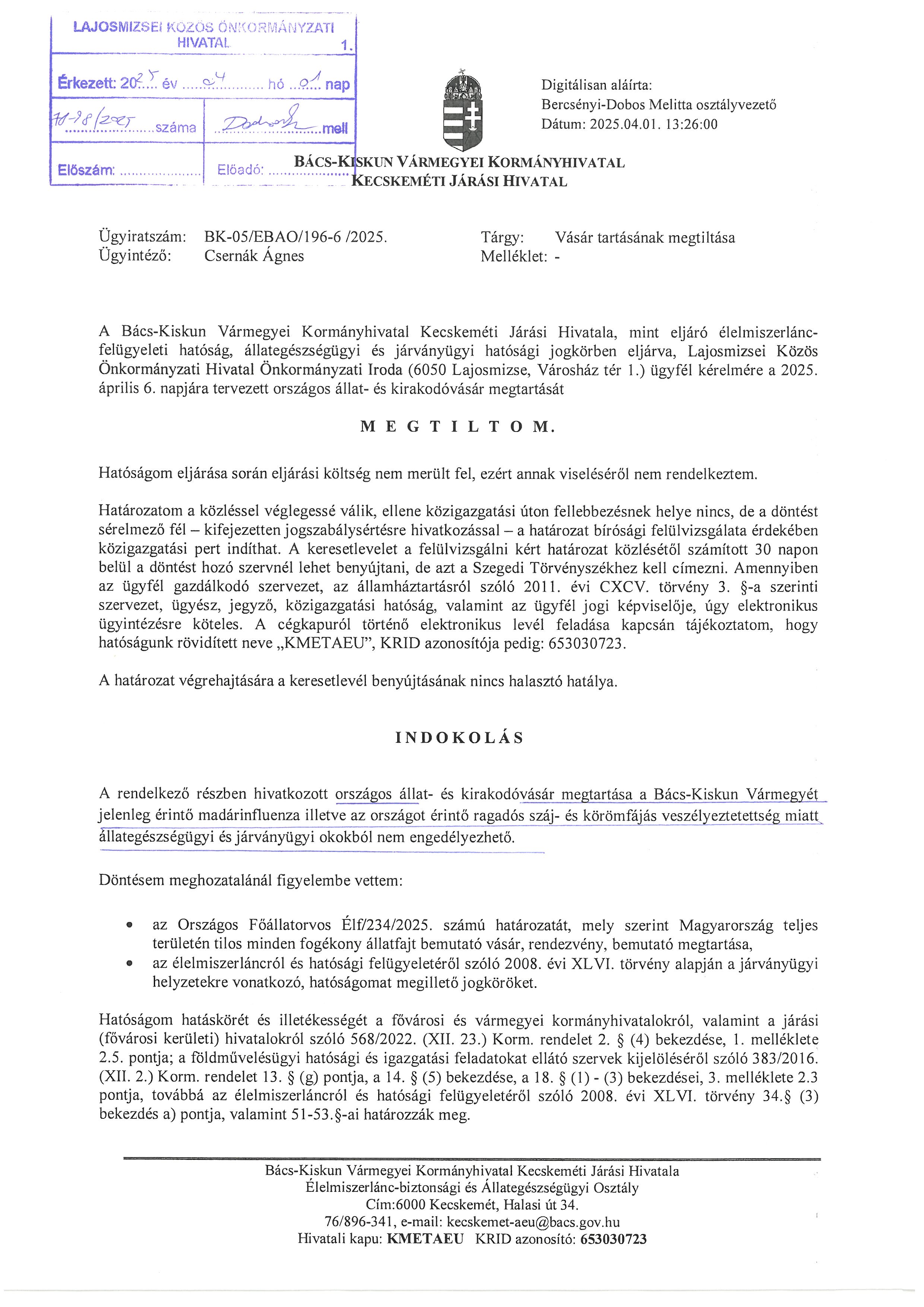 Továbbá tájékoztatjuk a Lajosmizsei Vásár Árusítóit és Vevőit, hogy a Bács-Kiskun Megyei Kormányhivatal Kecskeméti Járási Hivatala Élelmiszerlánc-biztonsági és Állategészségügyi Osztálya tájékoztatása alapján az országos állatvásár megtartása NEM ENGEDÉLYEZZETŐ a Bács-Kiskun Vármegyét jelenleg érintő madárinfluenza, illetve az országot érintő ragadós száj- és körömfájás veszélyeztetettség miatt állategészségügyi és járványügyi okokból!