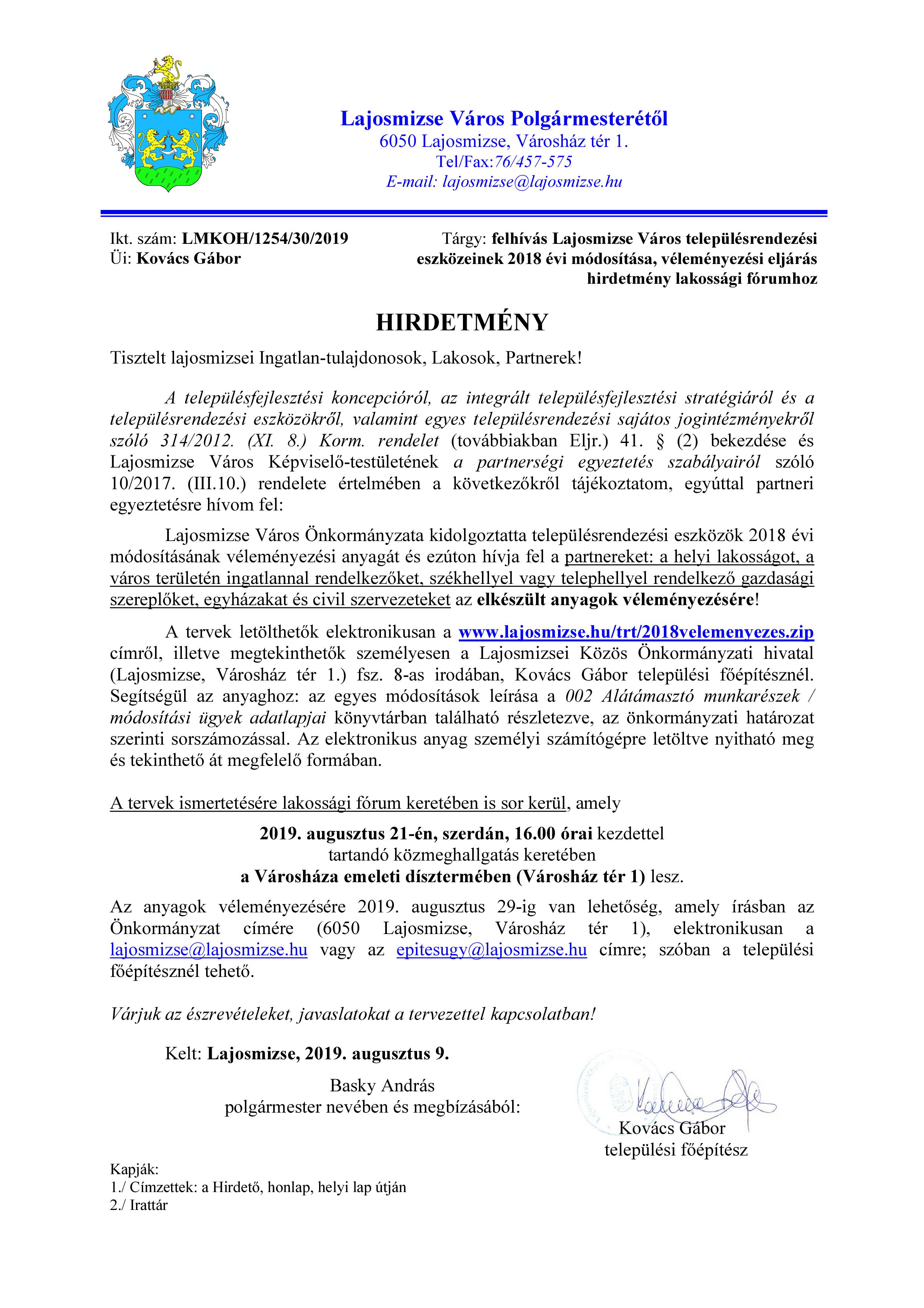 Terület Rendezési Terv 2018. augusztusában indított módosítás véleményezése