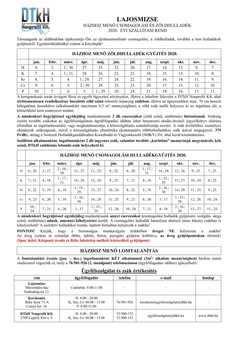 HÁZHOZ MENŐ CSOMAGOLÁSI ÉS ZÖLDHULLADÉK 2020. ÉVI SZÁLLÍTÁSI REND