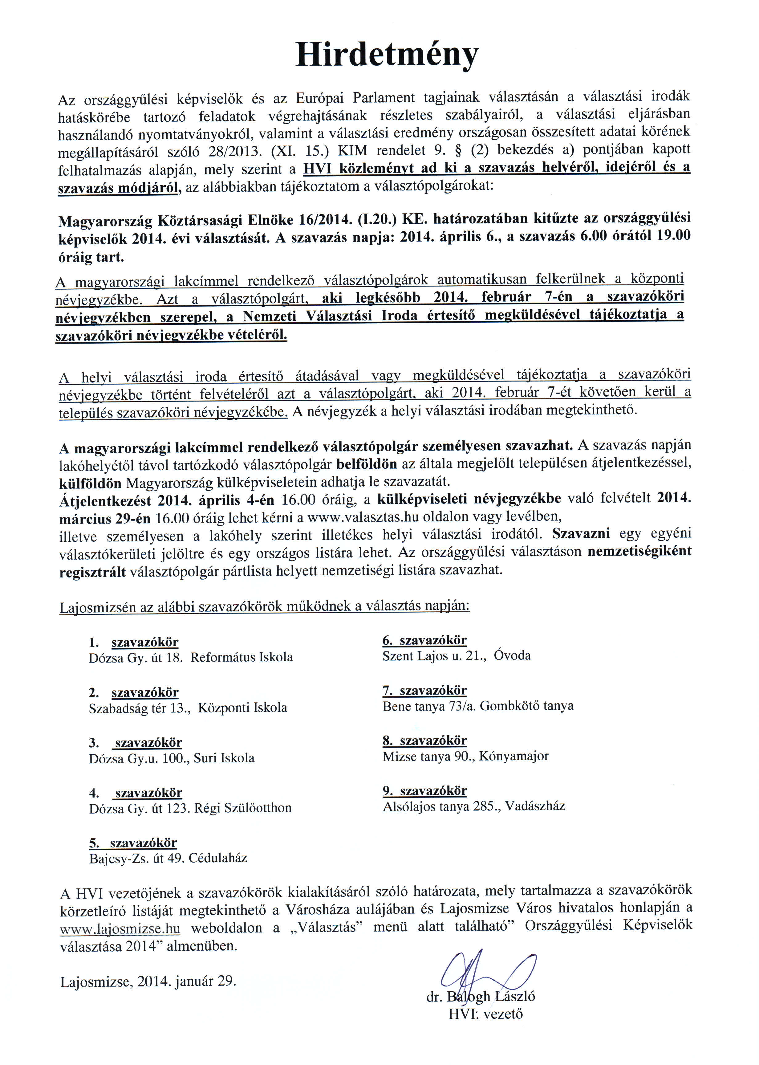 Az országgyűlési képviselők és az Európai Parlament tagjainak választásán a választási irodák hatáskörébe tartozó feladatok végrehajtásának részletes szabályairól, a választási eljárásban használandó nyomtatványokról, valamint a választási eredmény országosan összesített adatai körének megállapításáról szóló 28/2013. (XI. 15.) KIM rendelet 9. § (2) bekezdés a) pontjában kapott felhatalmazás alapján, mely szerint a HVI közleményt ad ki a szavazás helyéről, idejéről és a szavazás módjáról, az alábbiakban tájékoztatom a választópolgárokat: