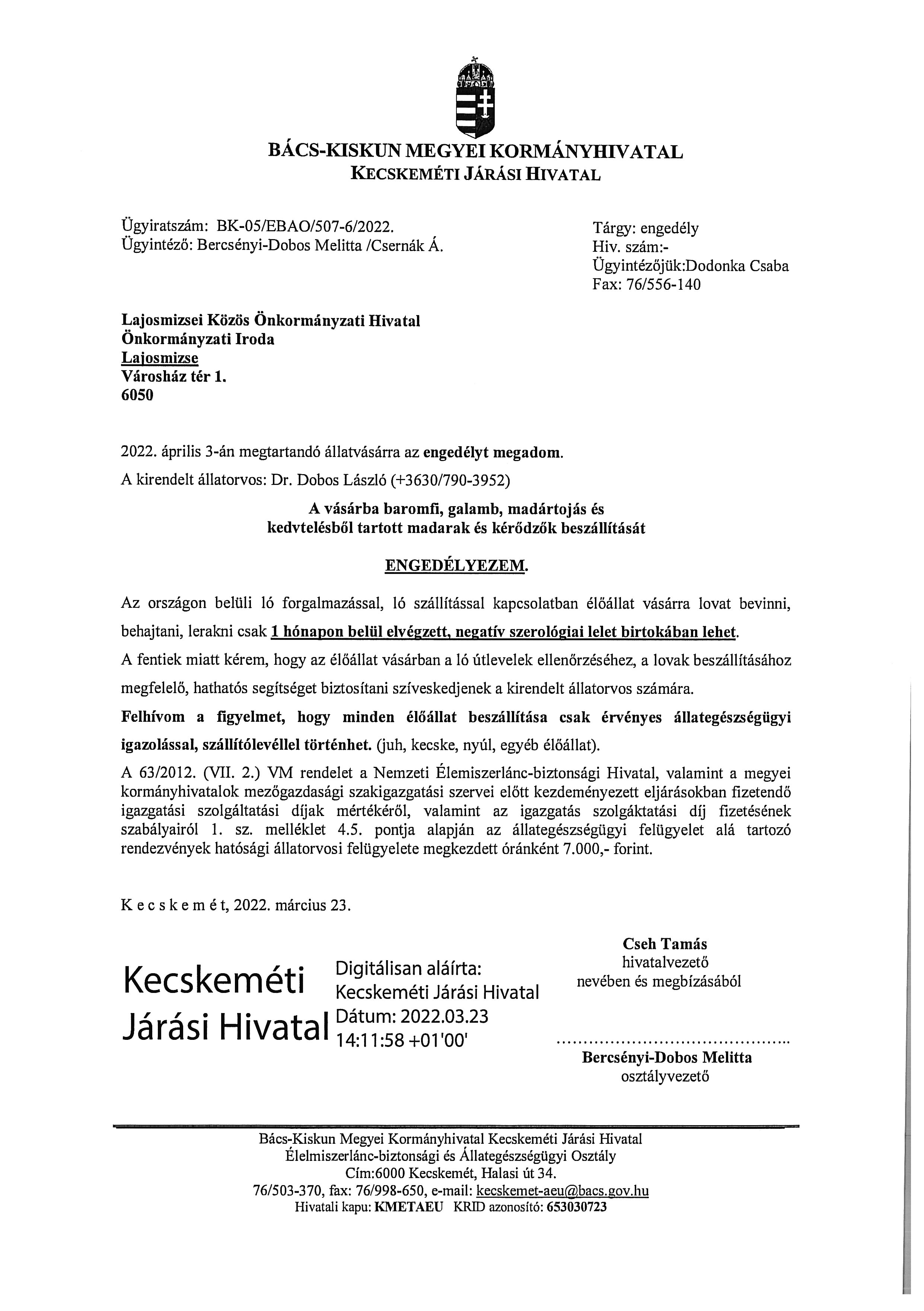Továbbá tájékoztatom a Lajosmizsei Vásár Árusítóit és Vevőit, hogy a Bács-Kiskun Megyei Kormányhivatal Kecskeméti Járási Hivatala Élelmiszerlánc-biztonsági és Állategészségügyi Osztálya tájékoztatása alapján az áprilisi vásárában a baromfi, galamb, madártojás, kedvtelésből tartott madarak és kérődzők beszállítása ENGEDÉLYEZETT. Az élőállat értékesítése csak érvényes állategészségügyi igazolással, szállítólevéllel történhet!