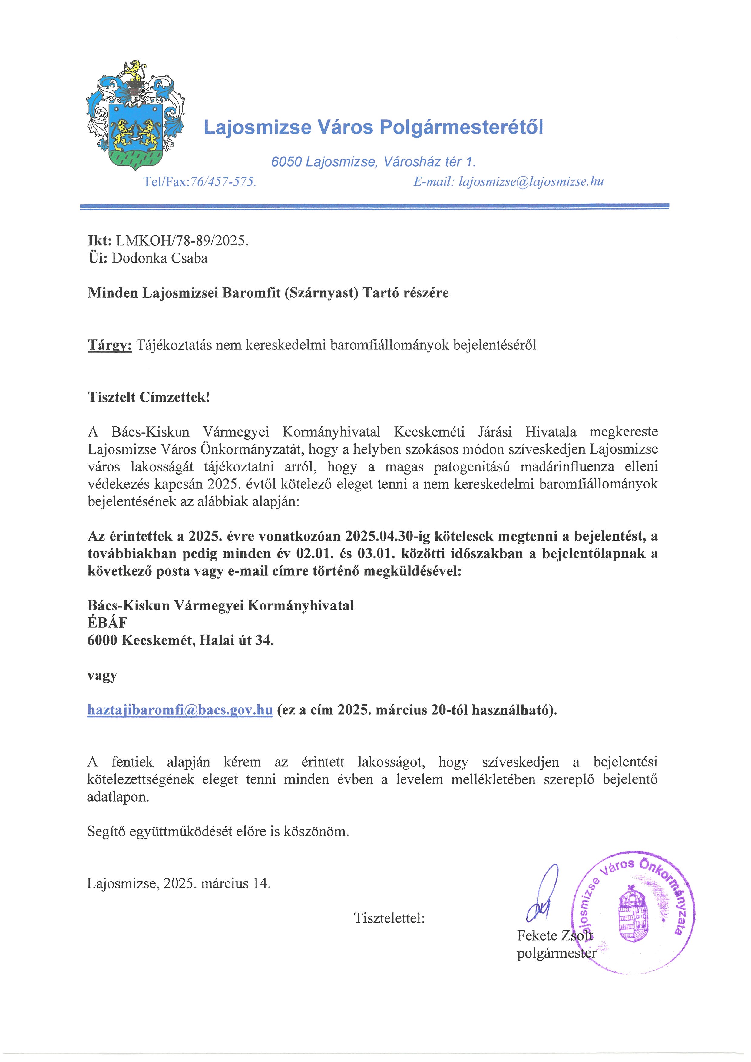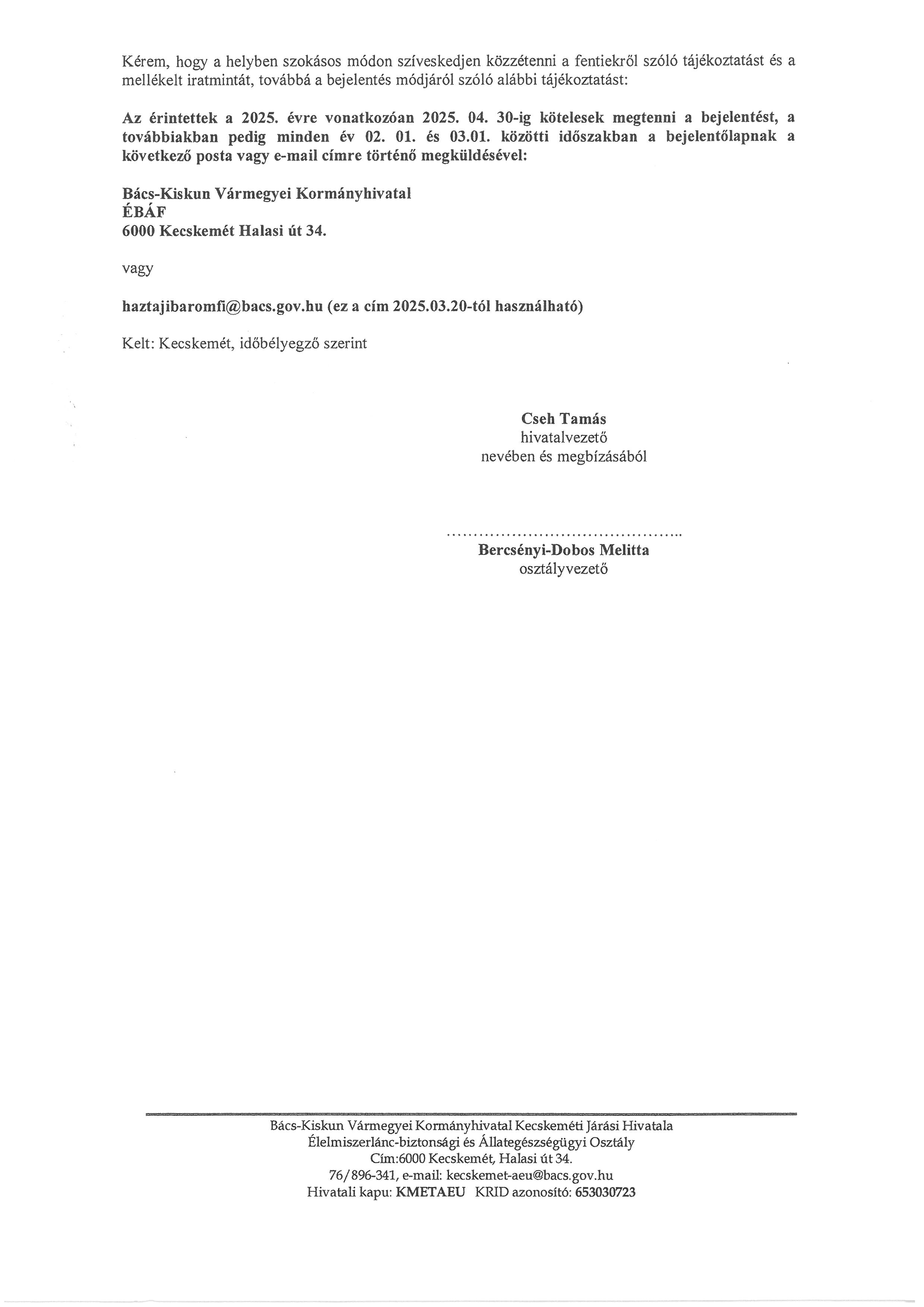 Tájékoztatás nem kereskedelmi baromfiállományok bejelentéséről