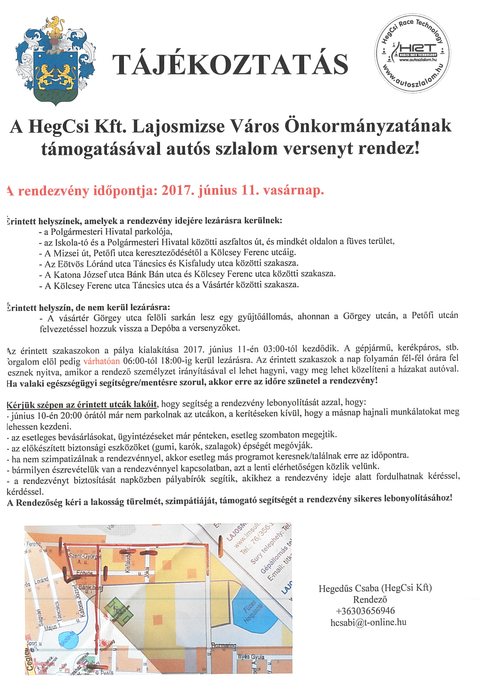 A HegCsi Kft. Lajosmizse Város Önkormányzatának támogatásával autós szlalom versenyt rendez 2017. június 11. vasárnapján. A rendezvénnyel kapcsolatos információk az alábbi tájékoztatóban megtalálható. A rendezvénnyel kapcsolatban kérjük a lakosság támogatását, megértését.